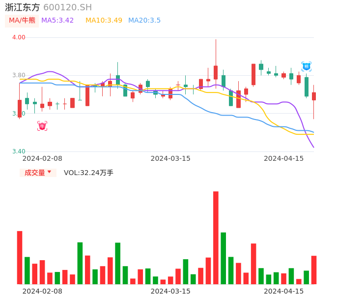 04月15日,浙江东方收报3.71,股价涨幅0.54%,成交金额1.19亿元,换手率0.94%。
