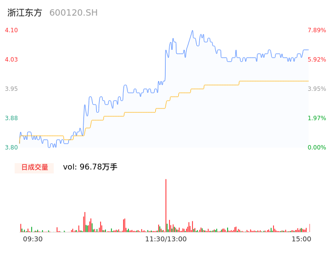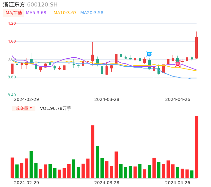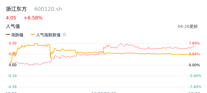 04月26日,浙江东方收报4.05,股价涨幅6.58%,成交金额3.85亿元,换手率2.83%。