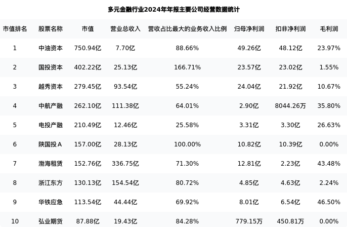 浙江东方最新报告期数据为年报,下表汇总了多元金融行业内市值靠前的公司年报主要经营数据
