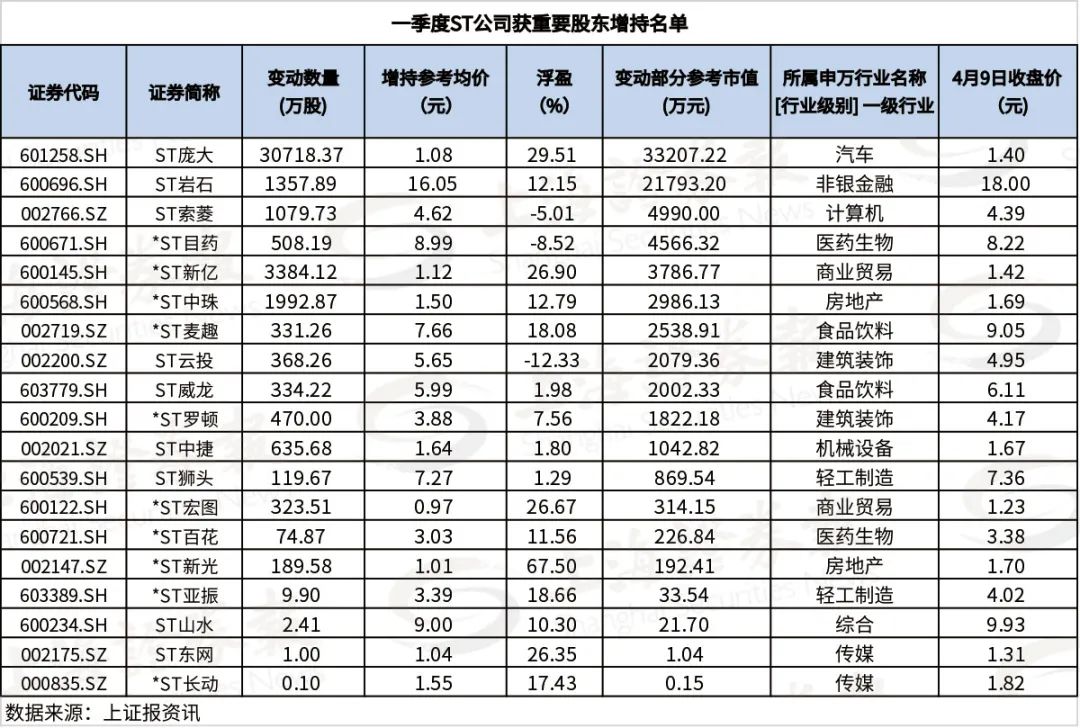 上证报资讯数据显示,2021年一季度共有19家ST公司获重要股东增持。截至4月9日收盘,8家公司股价收低于2元,其中*ST新亿、*ST宏图股价已低于1.5元。就增持金额来看,超过半数公司(11家)斥资超千万元,ST庞大、ST岩石更是获股东斥资上亿元增持。