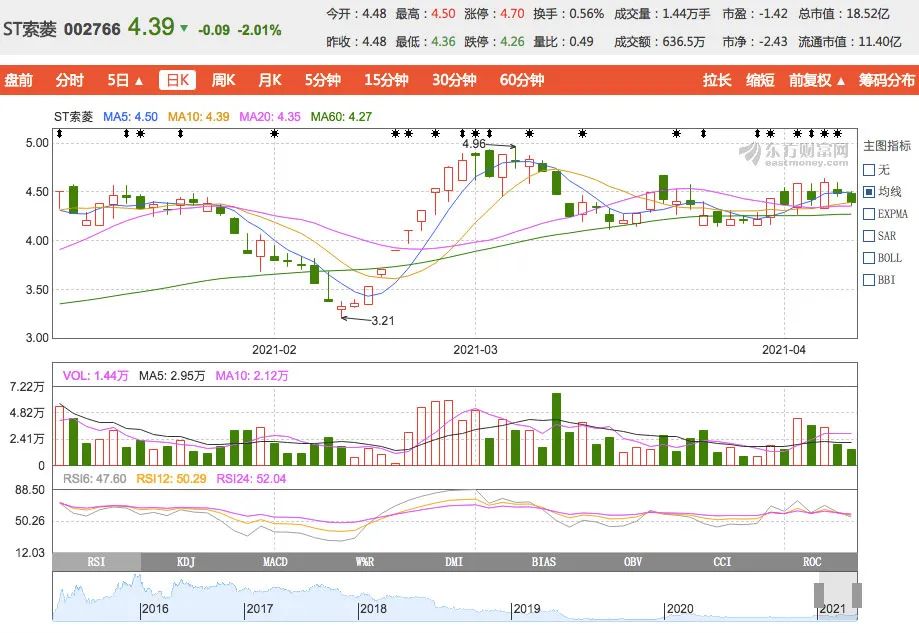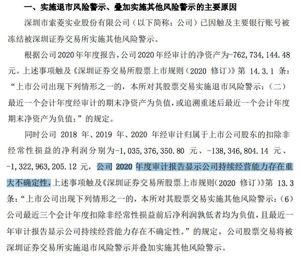 公司最新公告显示,公司股票自2021年4月13日起被实施“退市风险警示”特别处理,同时叠加实施“其他风险警示”特别处理,股票简称由“ST 索菱”变更为“*ST索菱”。