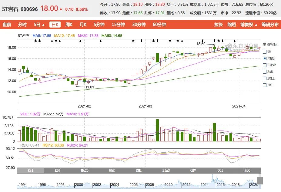或受此消息提振,ST岩石股价迅速拉升,自2月23日起连续七个交易日封上涨停板。公司最新公告显示,截至3月23日,贵酒发展及其一致行动人上海鸿褚、上海泓虔已累计增持公司股份约1357.89万股。
