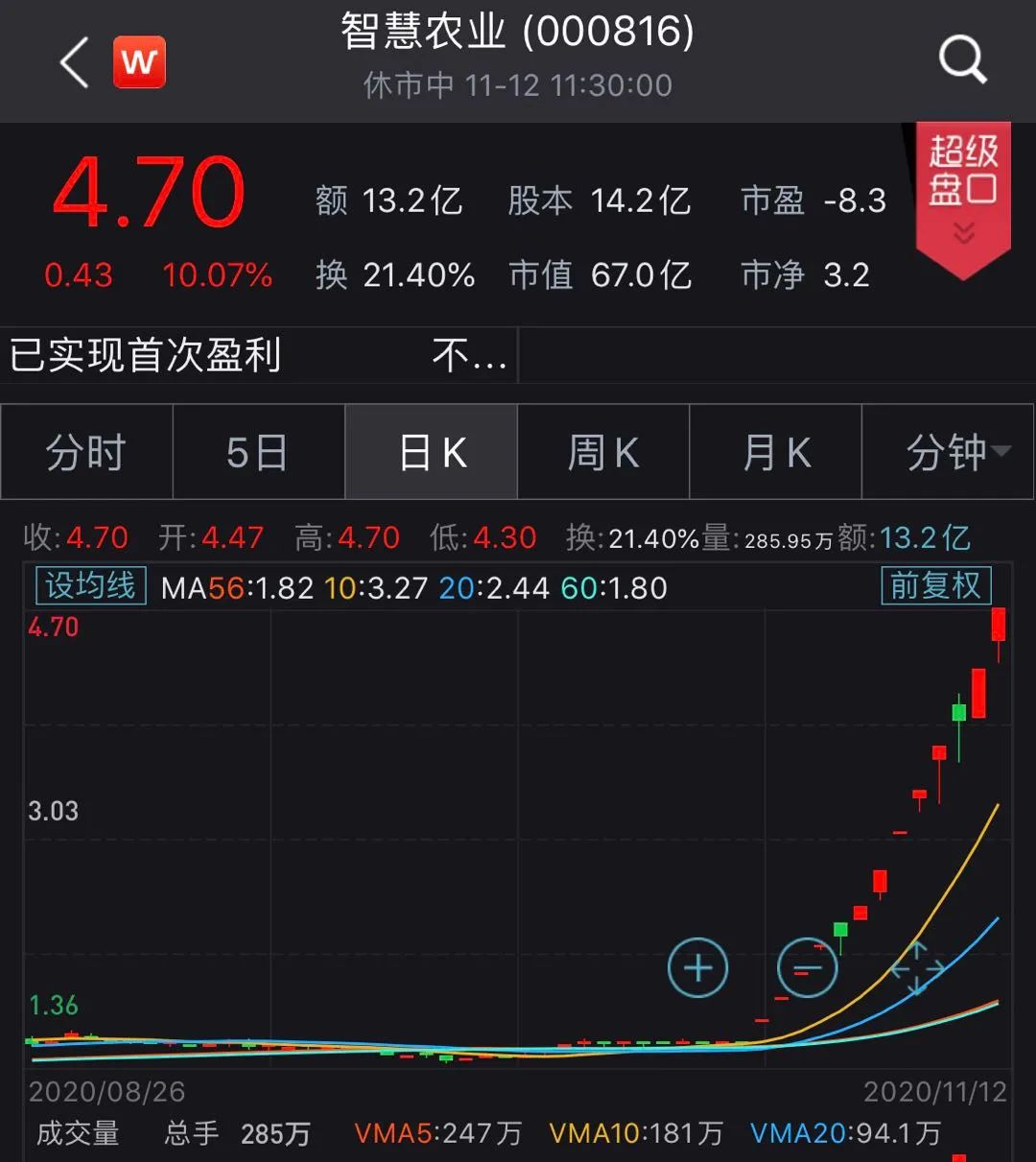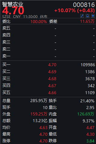 此前已连涨12天的智慧农业,今日早盘再次涨停,报4.7元/股,成交额为13.23亿元,换手率为21.4%,10月27日以来累计涨幅已达213.33%。