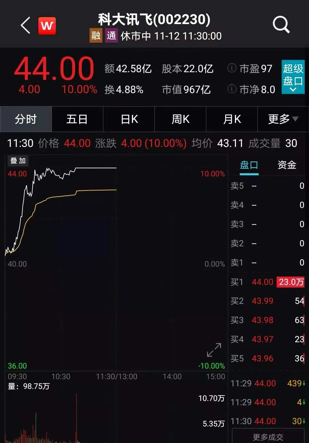 除了ST股继续异动,科大讯飞开盘后不久也快速拉升至涨停,报44元,成交额为42.58亿元,换手率为4.88%,总市值为967亿元。