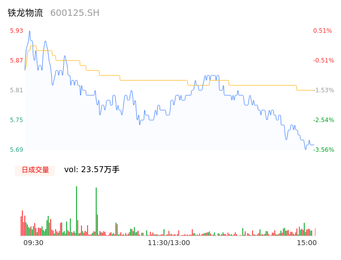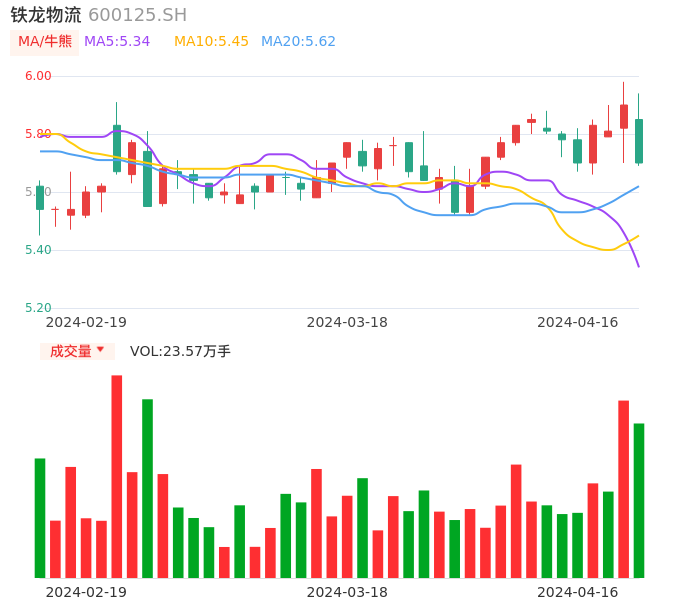 04月16日,铁龙物流收报5.70,股价涨幅-3.39%,成交金额1.37亿元,换手率1.81%。