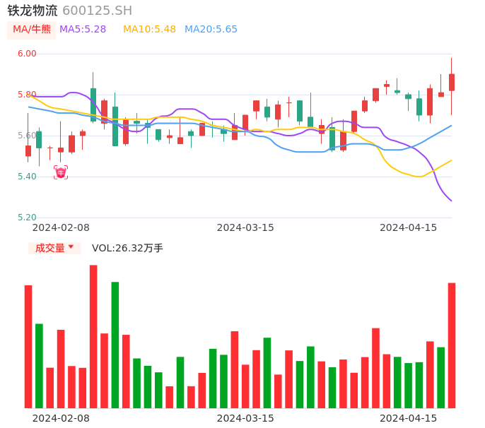 04月15日,铁龙物流收报5.90,股价涨幅1.55%,成交金额1.55亿元,换手率2.02%。