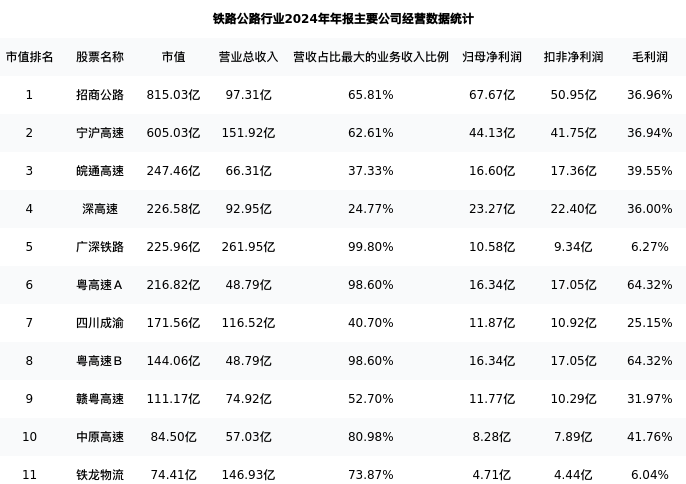 铁龙物流最新报告期数据为年报,下表汇总了铁路公路行业内市值靠前的公司年报主要经营数据