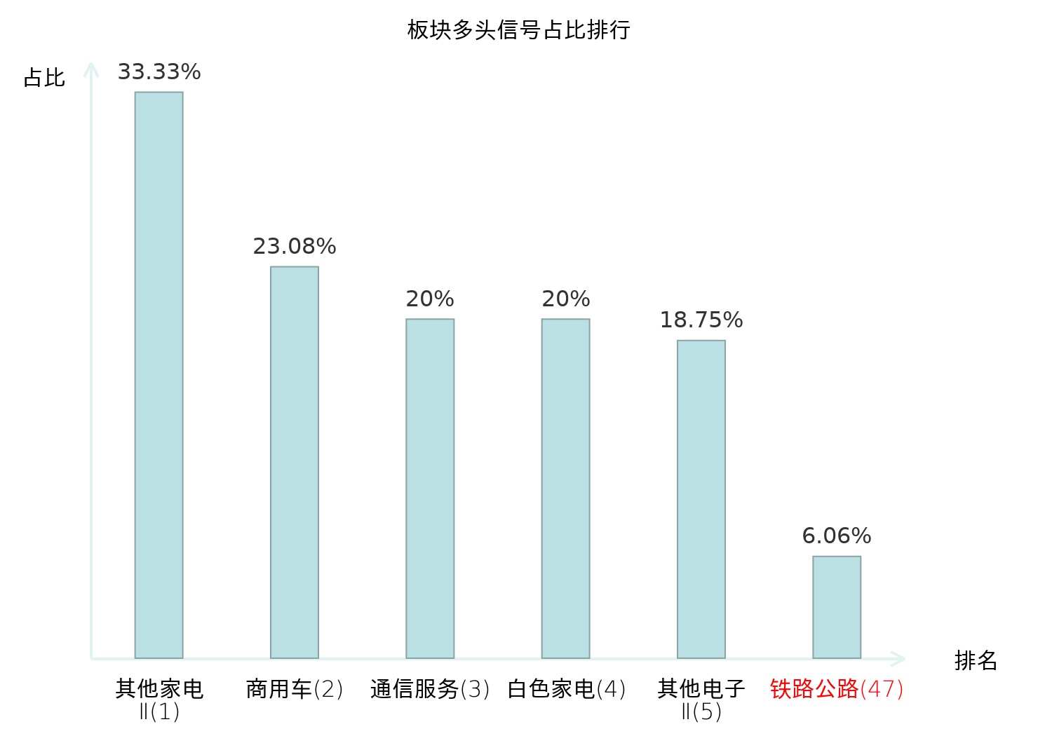 全市场所有行业板块中主力多头信号占比排名中,其他家电Ⅱ板块位居第一。其他家电Ⅱ板块名次提升最快,较昨日上升129位。