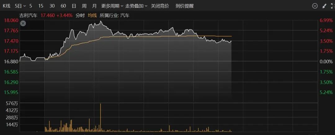 二级市场上,港股吉利汽车一度冲高涨近7%,截至发稿,涨幅回落至3.44%。