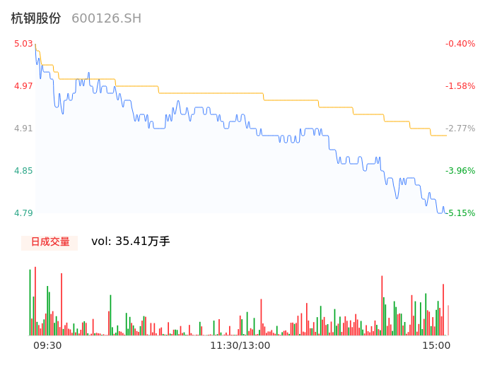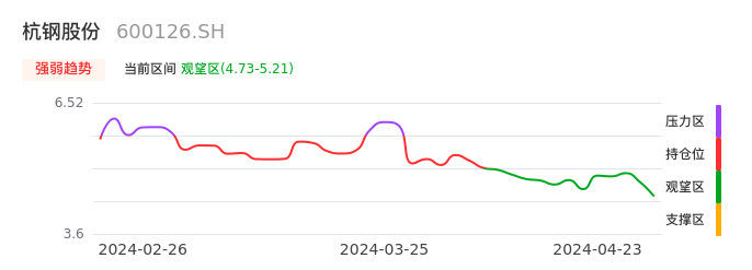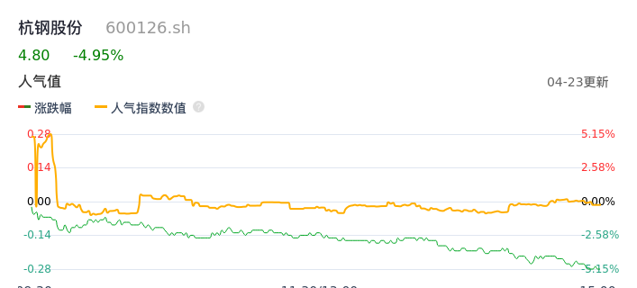 04月23日,杭钢股份收报4.80,股价涨幅-4.95%,成交金额1.73亿元,换手率1.05%。