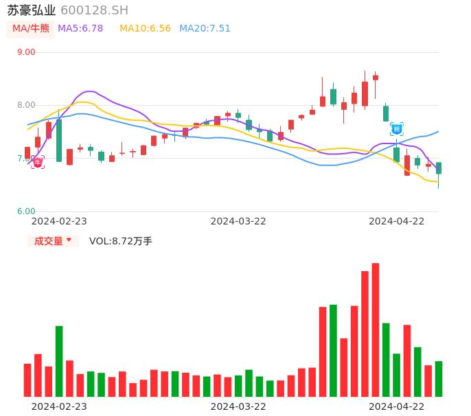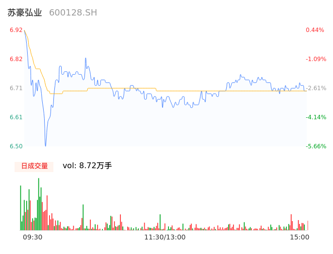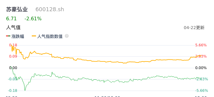 04月22日,苏豪弘业收报6.71,股价涨幅-2.61%,成交金额5847.41万元,换手率3.54%。
