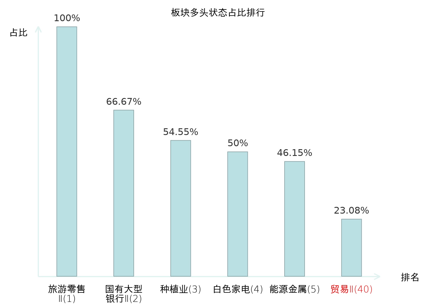 全市场所有行业板块中主力多头状态占比排名中,旅游零售Ⅱ板块位居第一。食品加工板块名次提升最快,较昨日上升57位。