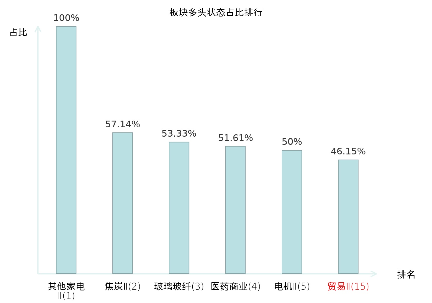全市场所有行业板块中主力多头状态占比排名中,其他家电Ⅱ板块位居第一。白色家电板块名次提升最快,较昨日上升67位。