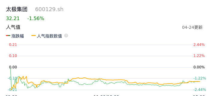 04月24日,太极集团收报32.21,股价涨幅-1.56%,成交金额3.80亿元,换手率2.13%。