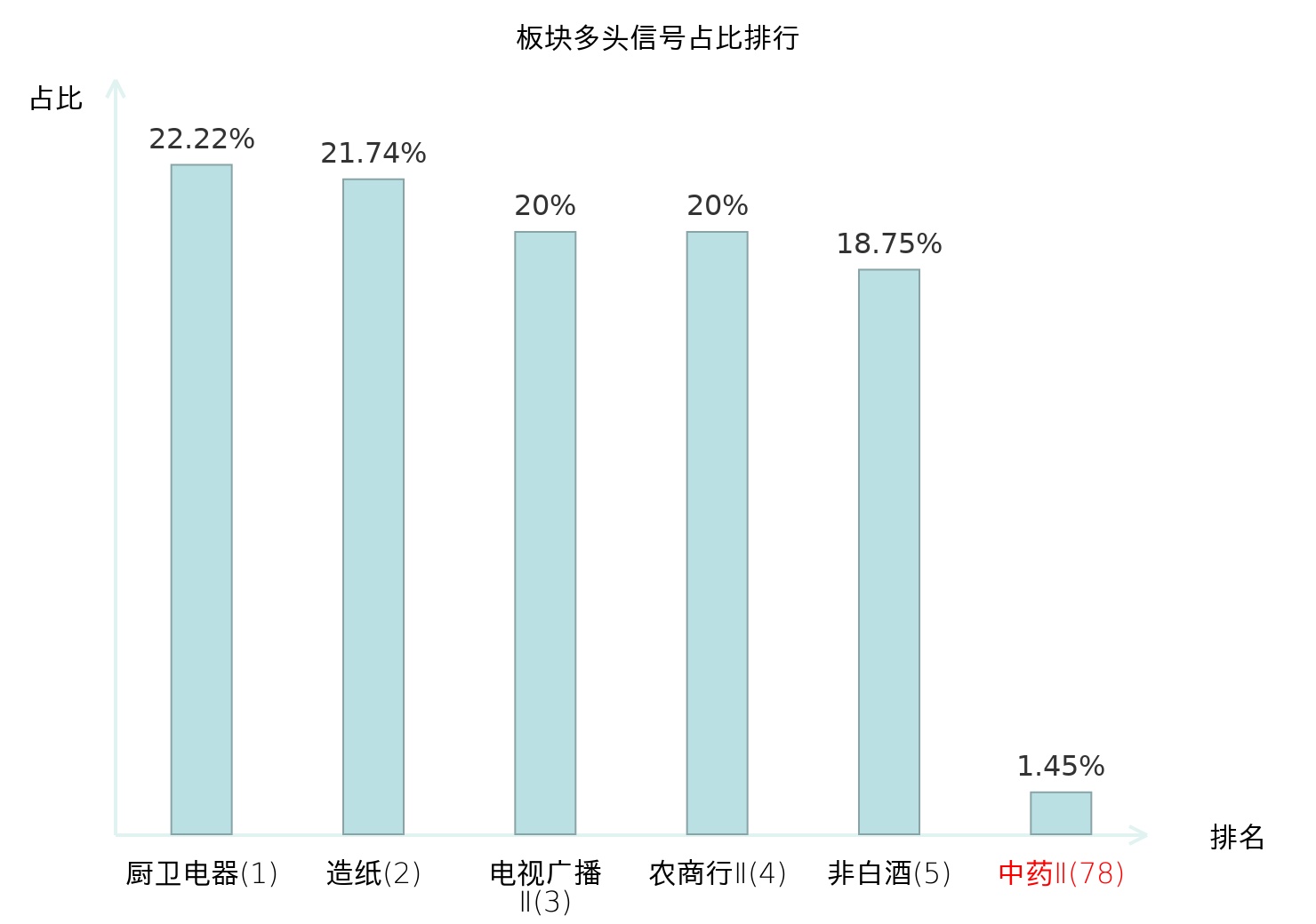 全市场所有行业板块中主力多头信号占比排名中,厨卫电器板块位居第一。厨卫电器板块名次提升最快,较昨日上升115位。