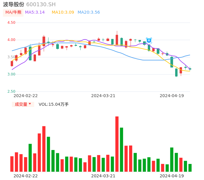 04月19日,波导股份收报3.14,股价涨幅-1.57%,成交金额4734.57万元,换手率1.96%。