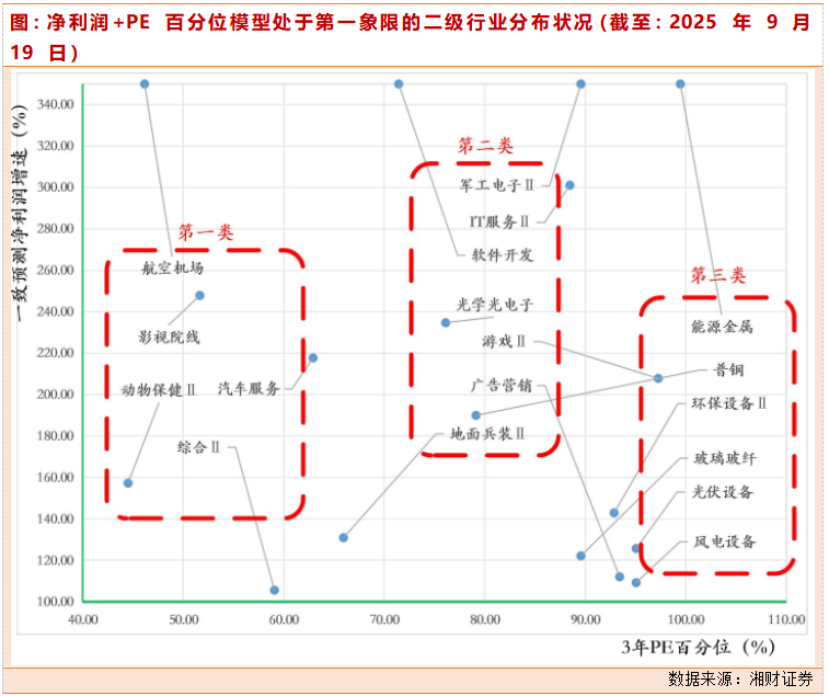 同时10月份的节点来看,逐渐进入三季报的披露窗口,结合一些高预期的计入,可能面临波动,在基本面+市场面的净利润+PE百分位模型中,由于目前3年期PE百分位整体偏高,我们在一致预测净利润增速中,取100%以上的申万二级行业,可分为三大类: