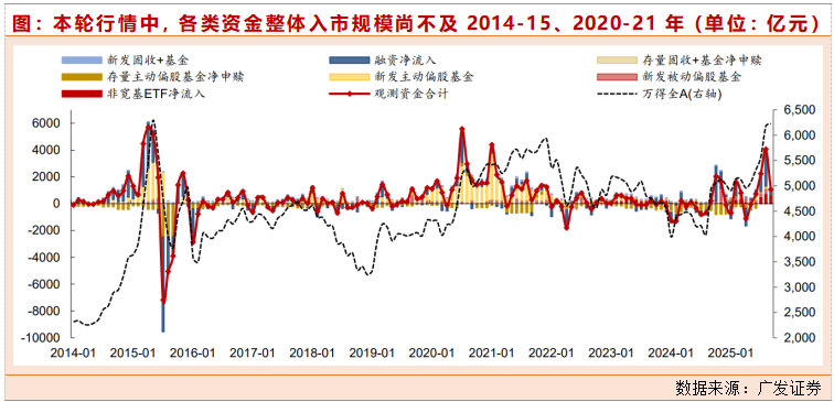 选用几个典型的居民主要的入市渠道求和:①融资盘;②新发基金:包括主动偏股、被动偏股、固收+基金;③ 存量基金申赎:包括固收+基金与主动偏股基金;④非宽基股票型ETF净流入。