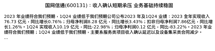 值得注意的是:2024年04月中金公司的曲昊源/车姝韵/曾韬/刘倩文分析师,首次发布关于国网信通的研究报告,标题为:国网信通(600131):收入确认短期承压 业务基础持续稳固。