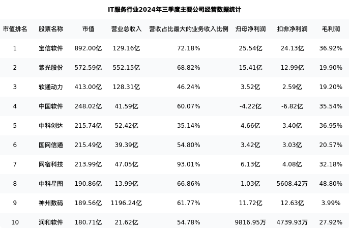 国网信通最新报告期数据为三季度,下表汇总了IT服务行业内市值靠前的公司三季度主要经营数据