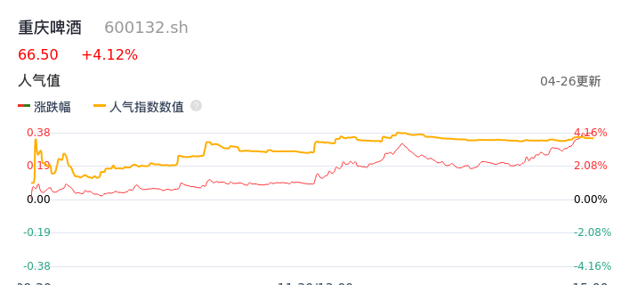 04月26日,重庆啤酒收报66.50,股价涨幅4.12%,成交金额4.41亿元,换手率1.40%。