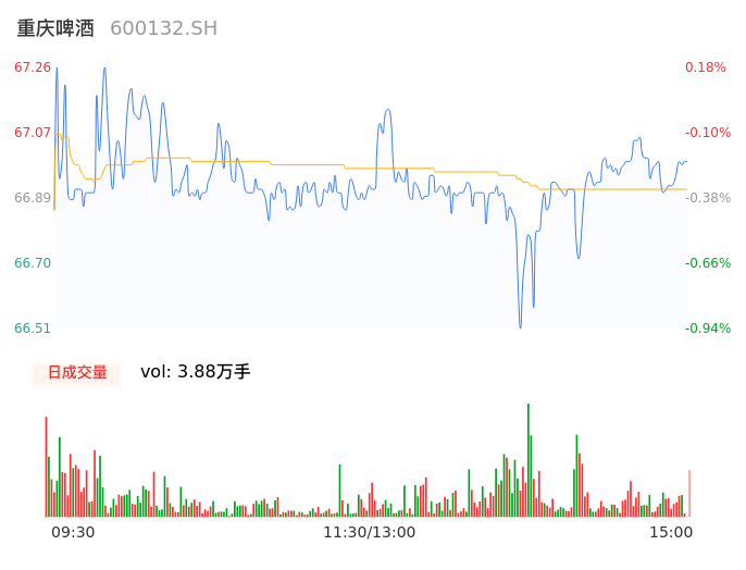 04月10日,重庆啤酒收报67.00,股价涨幅-0.21%,成交金额2.60亿元,换手率0.80%。