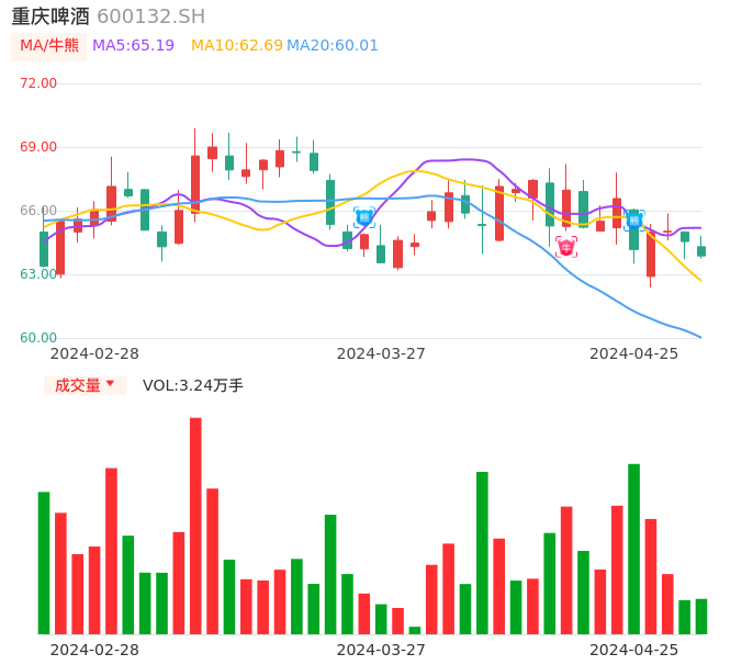 值得注意的是:2024年04月广发证券的符蓉/郝宇新/杨琳琳分析师,首次发布关于重庆啤酒的研究报告,标题为:重庆啤酒(600132):稳健增长 高比例分红。