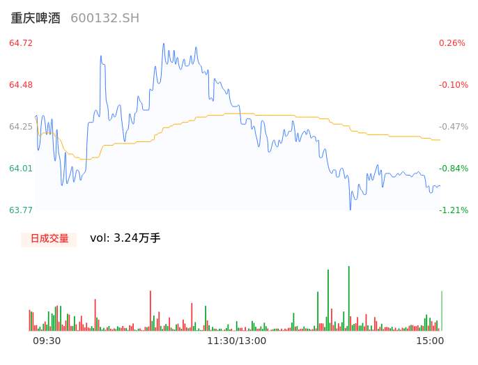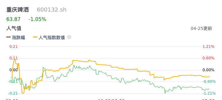04月25日,重庆啤酒收报63.87,股价涨幅-1.05%,成交金额2.08亿元,换手率0.67%。