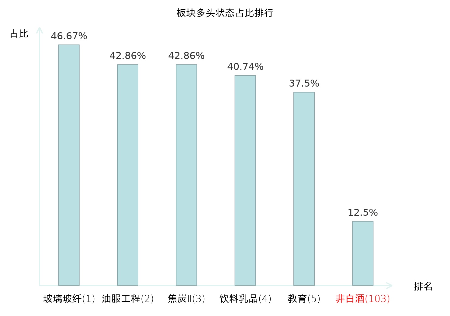 全市场所有行业板块中主力多头状态占比排名中,玻璃玻纤板块位居第一。航空机场板块名次提升最快,较昨日上升43位。