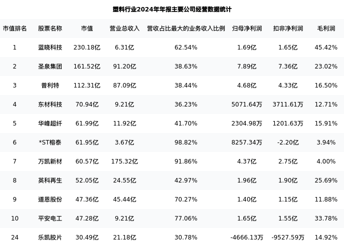乐凯胶片最新报告期数据为年报,下表汇总了塑料行业内市值靠前的公司年报主要经营数据