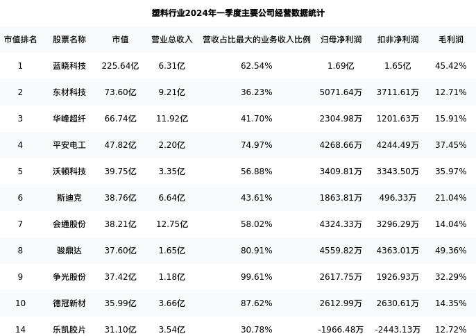 乐凯胶片最新报告期数据为一季度,下表汇总了塑料行业内市值靠前的公司一季度主要经营数据