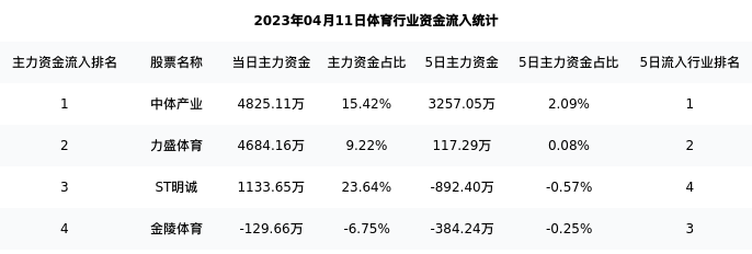 从主力资金流向来看,体育行业今日主力资金流入4.68亿元,在所有申万二级行业中排名:54/131。