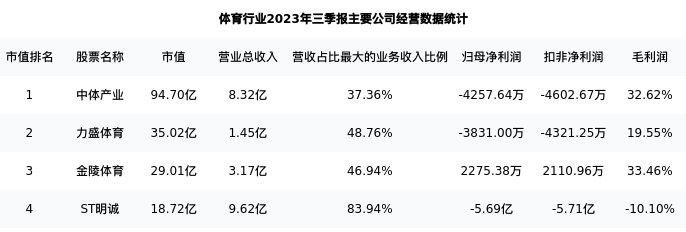 ST明诚最新报告期数据为三季报,下表汇总了体育行业内市值靠前的公司三季报主要经营数据