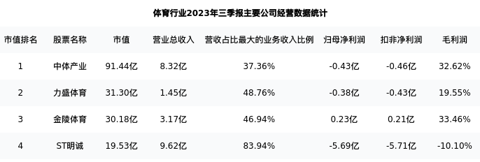 ST明诚最新报告期数据为三季报,下表汇总了体育行业内市值靠前的公司三季报主要经营数据