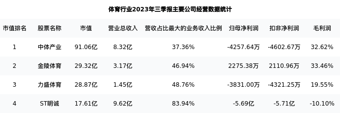 ST明诚最新报告期数据为三季报,下表汇总了体育行业内市值靠前的公司三季报主要经营数据