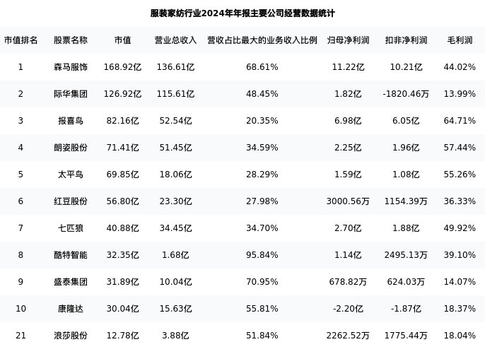 浪莎股份最新报告期数据为年报,下表汇总了服装家纺行业内市值靠前的公司年报主要经营数据