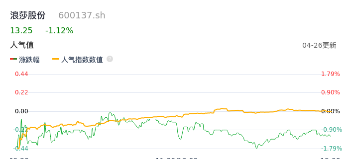 04月26日,浪莎股份收报13.25,股价涨幅-1.12%,成交金额2877.98万元,换手率2.23%。