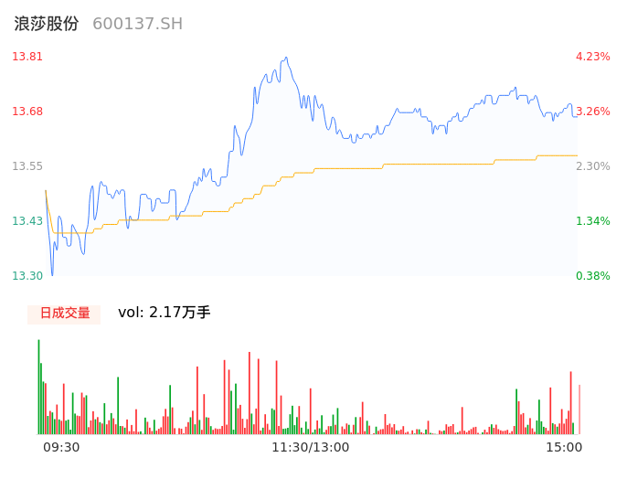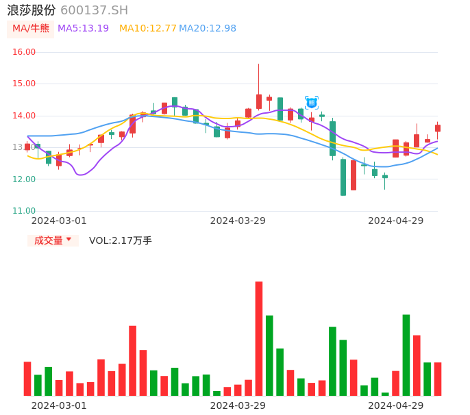04月29日,浪莎股份收报13.70,股价涨幅3.40%,成交金额2950.05万元,换手率2.23%。