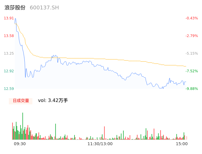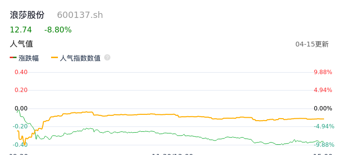 04月15日,浪莎股份收报12.74,股价涨幅-8.80%,成交金额4453.30万元,换手率3.52%。