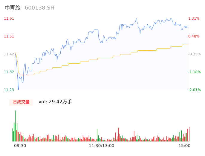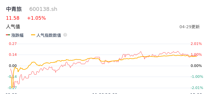 04月29日,中青旅收报11.58,股价涨幅1.05%,成交金额3.38亿元,换手率4.06%。