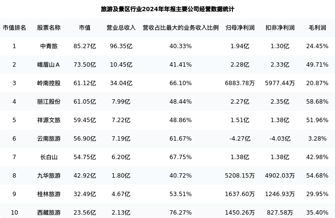 中青旅最新报告期数据为年报,下表汇总了旅游及景区行业内市值靠前的公司年报主要经营数据