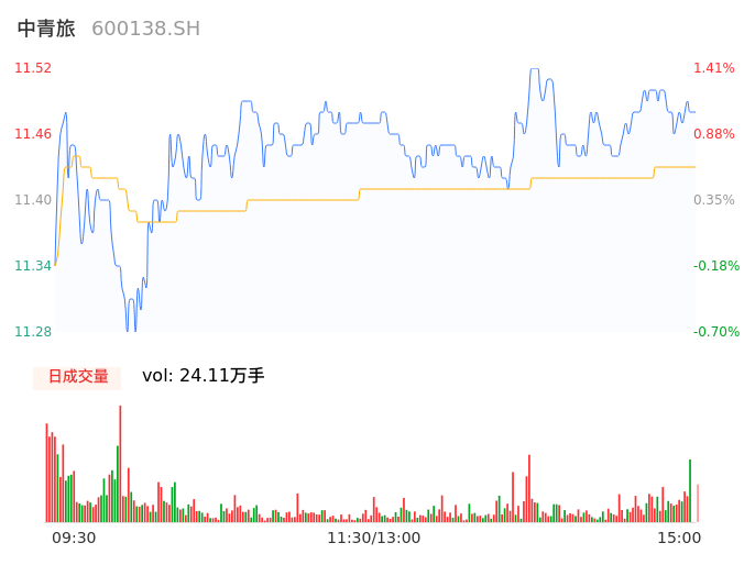 04月24日,中青旅收报11.48,股价涨幅1.06%,成交金额2.76亿元,换手率3.33%。
