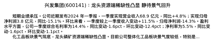 值得注意的是:2024年06月东方证券的万里扬/顾雪莺分析师,首次发布关于兴发集团的研究报告,标题为:兴发集团(600141):龙头资源端稀缺性凸显 静待景气回升。