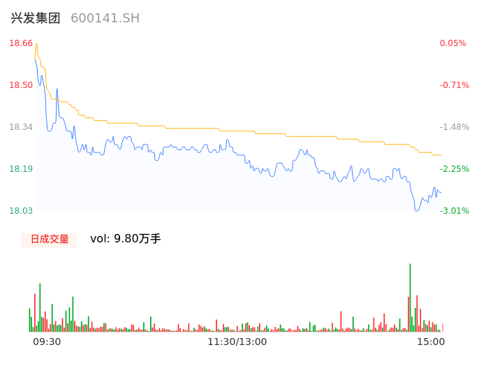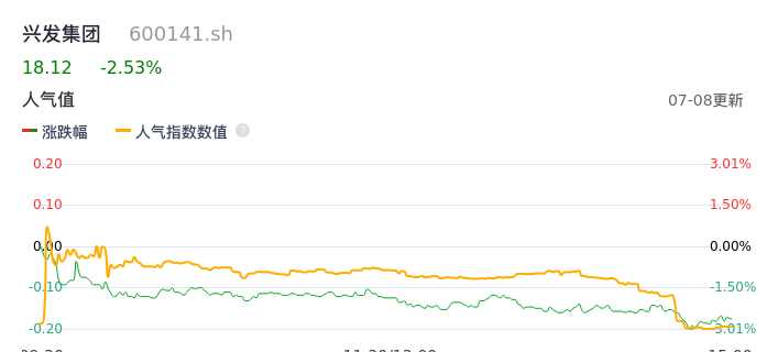 07月08日,兴发集团收报18.12,股价涨幅-2.53%,成交金额1.79亿,换手率0.89%。