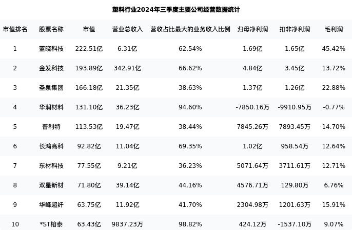 金发科技最新报告期数据为三季度,下表汇总了塑料行业内市值靠前的公司三季度主要经营数据