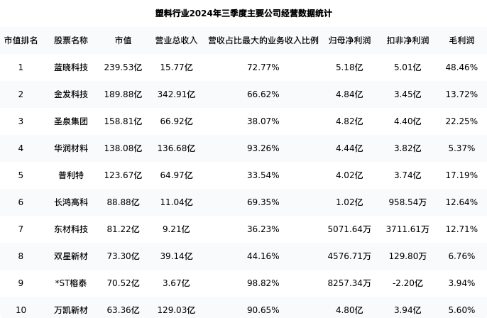 金发科技最新报告期数据为三季度,下表汇总了塑料行业内市值靠前的公司三季度主要经营数据