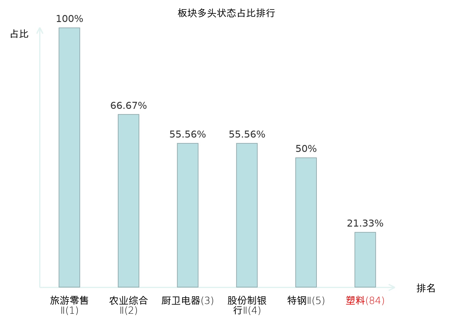 全市场所有行业板块中主力多头状态占比排名中,旅游零售Ⅱ板块位居第一。装修装饰Ⅱ板块名次提升最快,较昨日上升75位。
