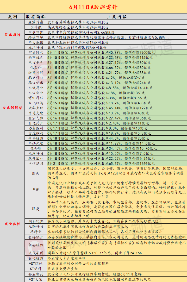 17、宁德时代:6月11日解禁,解禁规模占公司总股本40.88%,预估金额4129亿元。