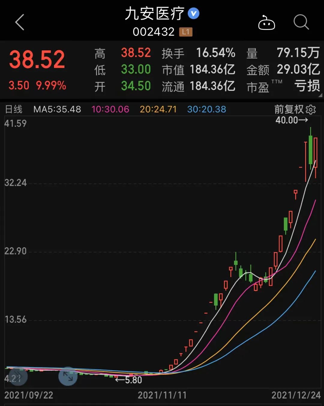 关注函发布后,今日九安医疗开盘短暂下跌,随后继续强势拉升,近11点冲到涨停。九安医疗已成为近期A股市场中涨幅最大的个股,近30个交易日已实现20个涨停板,11月至今累计上涨538.81%,股价翻了5倍以上。