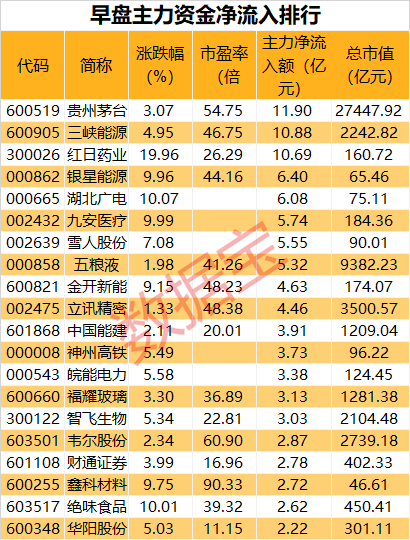 数据宝统计显示,今日早盘共有71股获得1亿元以上主力资金净流入,贵州茅台获净流入最高,为11.9亿元,三峡能源、红日药业紧随其后,分别为10.88亿元、10.69亿元。